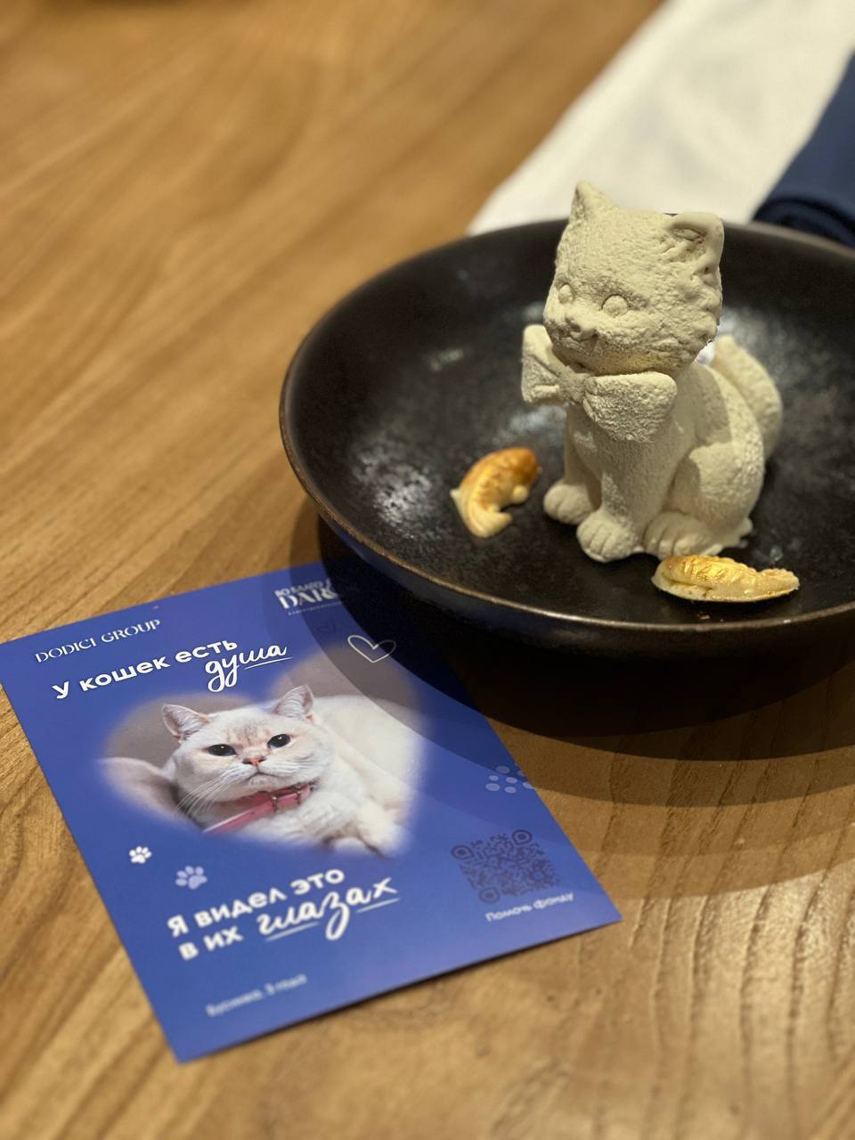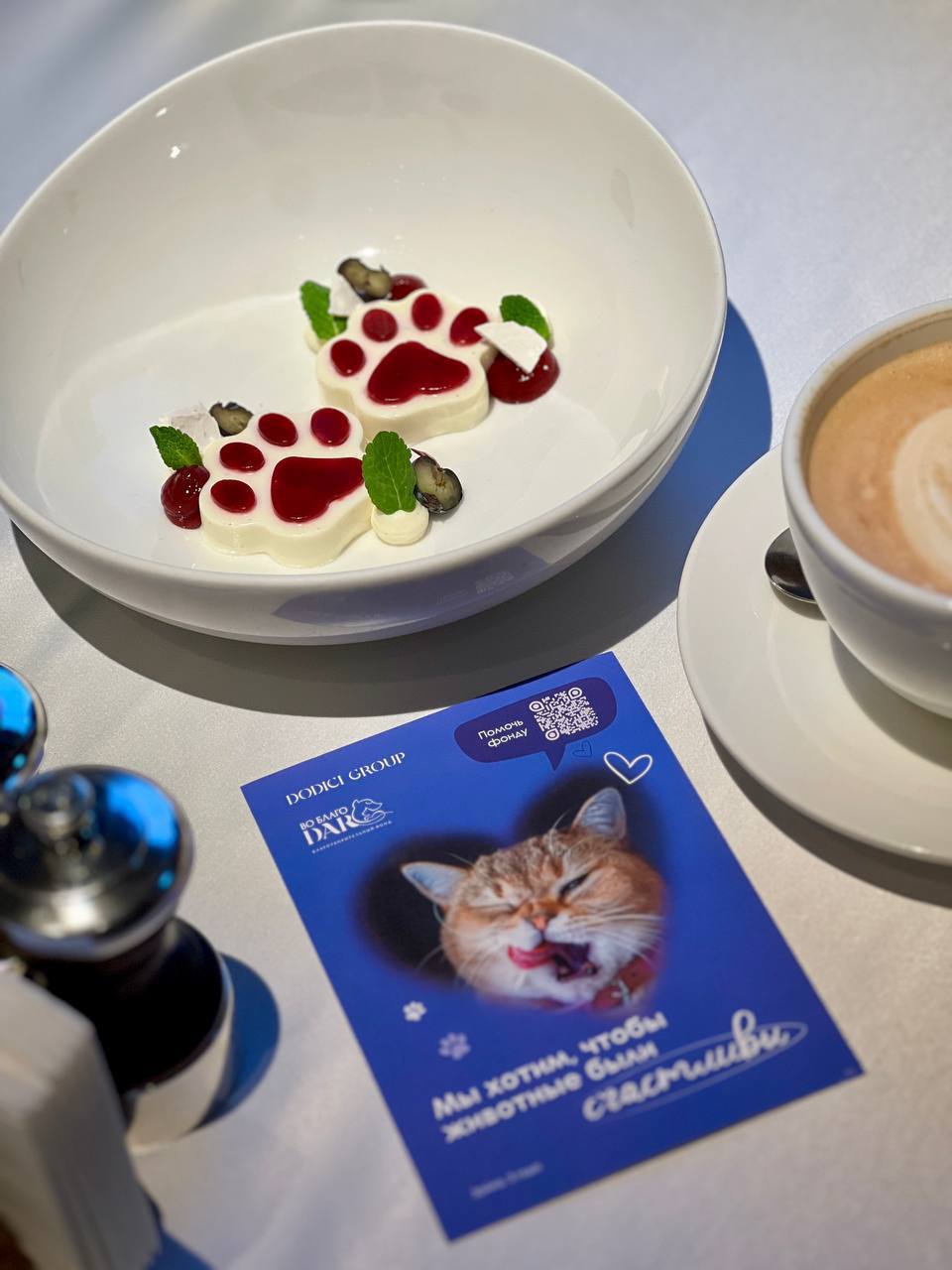 Командой ресторана был разработан фирменный десерт и открытки с подопечными фонда, часть средств от продажи которых были направлены в фонд на помощь бездомным животным.