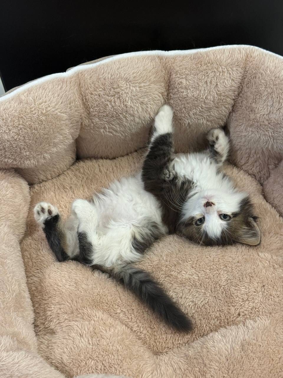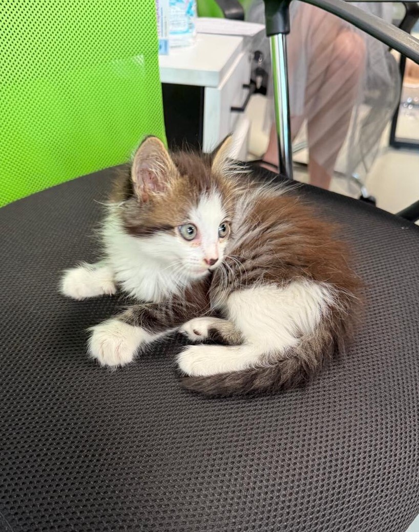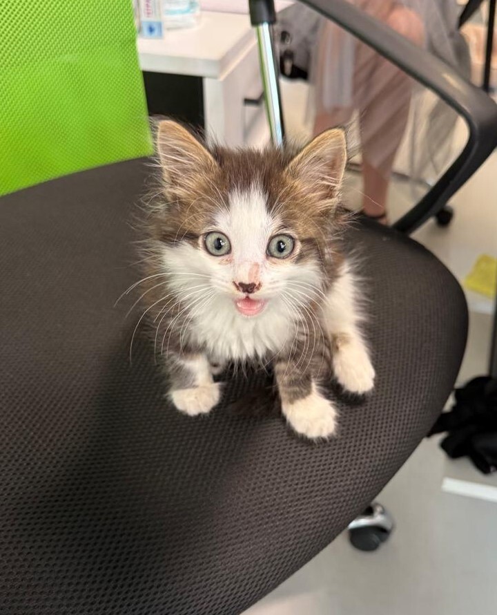 Теперь он в безопасности в офисе вместе с двумя другими спасёнными котиками, получил ветеринарную помощь и ждёт любящую семью.