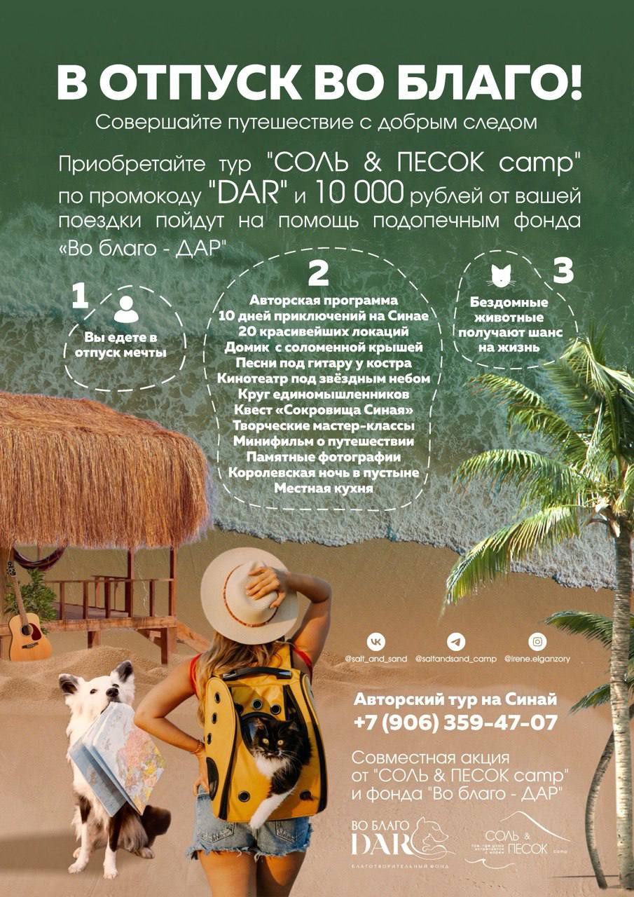 10 000 рублей от вашей поездки идут на помощь бездомным животным в благотворительный фонд «Во Благо-ДАР»